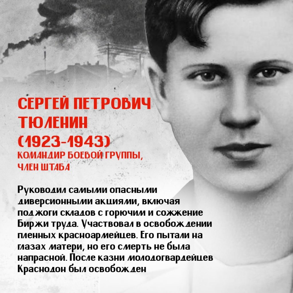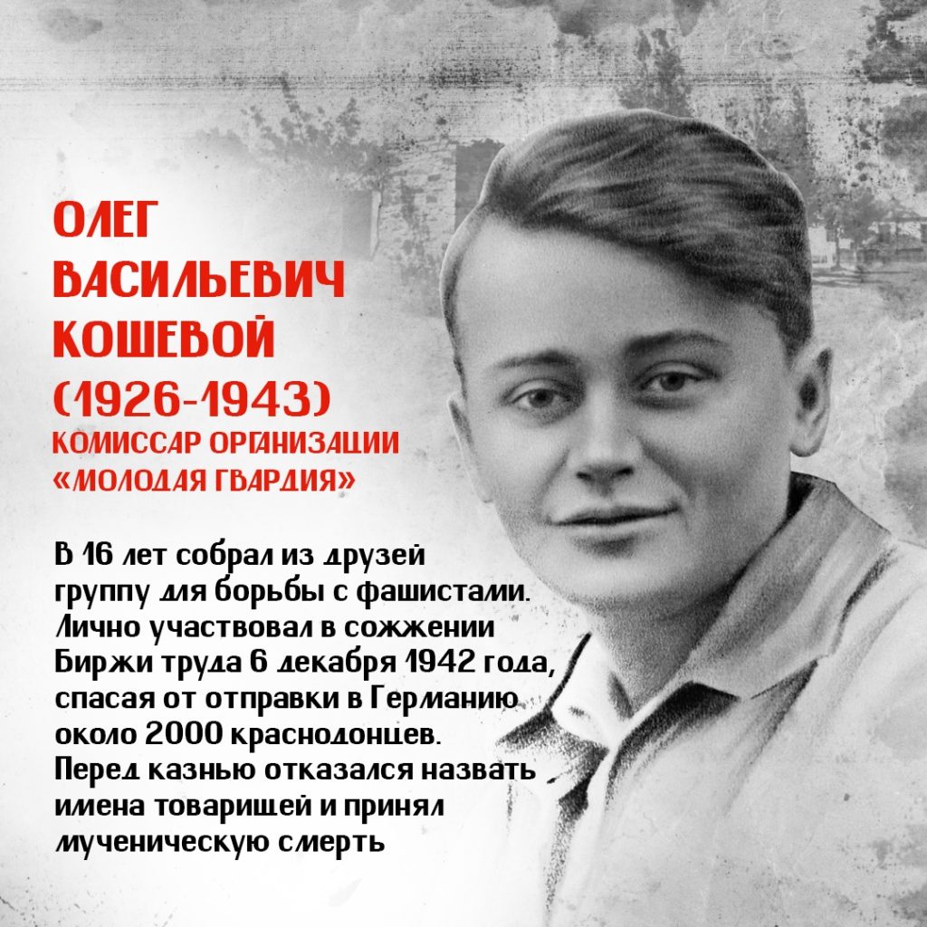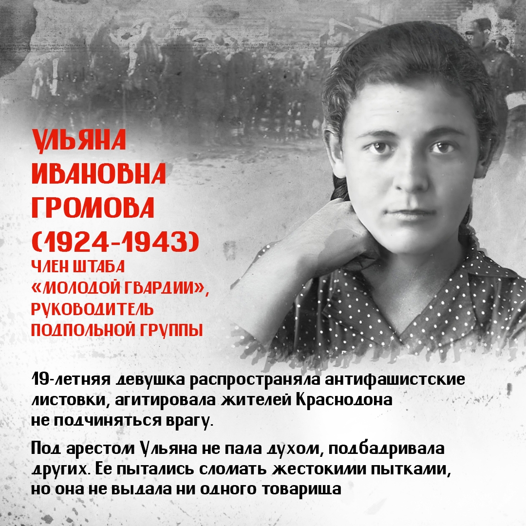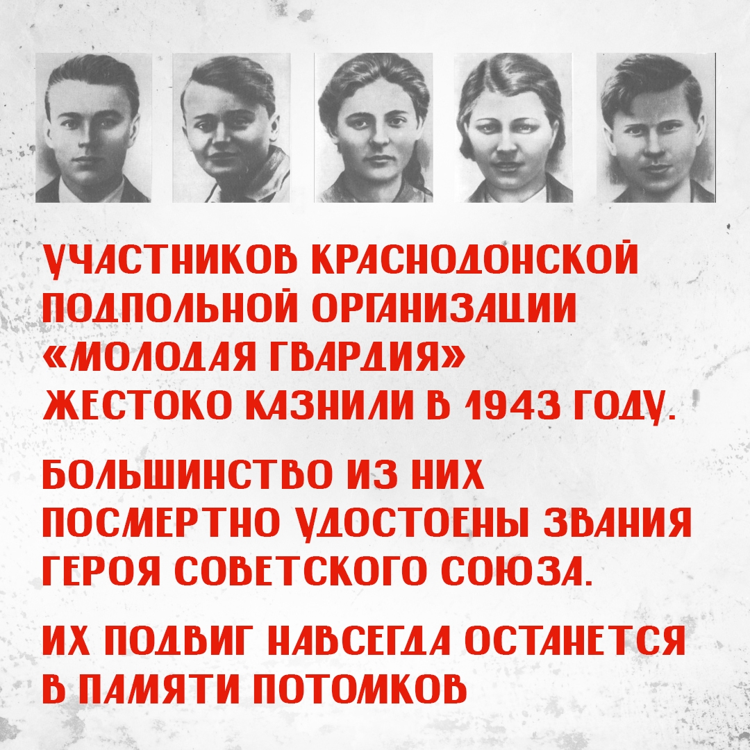Юные герои — Олег Кошевой, Ульяна Громова, Любовь Шевцова, Виктор Третьякевич, Сергей Тюленин и другие выдержали нечеловеческие пытки и погибли за сопротивление фашистской оккупации. Они были казнены гитлеровцами, так и не выдав своих. Большинству ребят было по 17-18 лет, а самому младшему едва исполнилось 14.